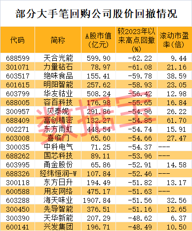 从二级市场表现来看,这些大手笔回购的公司股价普遍已深度调整。数据宝统计,1月15日收盘价与2023年以来高点相比,上述77家公司股价平均回撤35.18%,18股回撤幅度超50%,包括天合光能、力量钻石、绝味食品、明阳智能、华友钴业等。