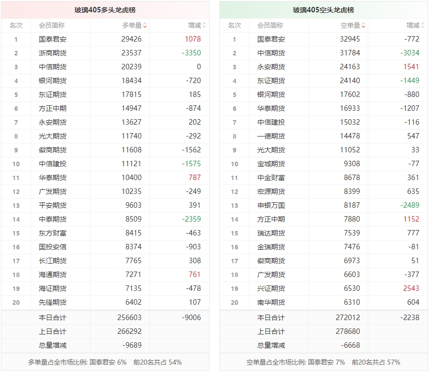 总体而言,玻璃405合约今日减仓上行,多空持仓排名前20席中,多空双方均呈退场态势,多头退场意愿强于空头。