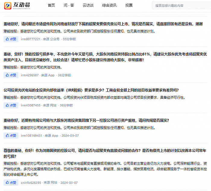 3月7日,豫能控股也被投资者在互动平台追问,“作为河南国资的控股公司,请问是否与超聚变有直接或间接的合作?是否有借壳上市的计划以改善本公司常年的亏损?”对此,这家由河南财政厅实际控制的上市公司回应称,“公司暂未与超聚变有直接或间接的合作”,公司目前主营业务仍为火力发电。