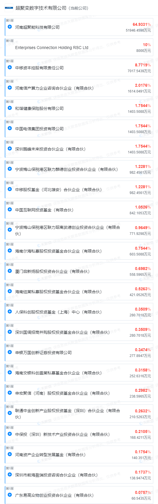 此后,经过多轮股权融资后,超聚变控股股东河南超聚能科技有限公司持股比例降至64.9331%,中国电信集团投资有限公司、中国移动旗下中移资本控股、联通旗下基金、和谐健康保险、中国互联网投资基金等陆续参股。