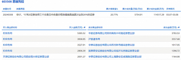 其中,思维列控3月8日龙虎榜显示,“超聚变重组”传闻热炒期间,公司股票在连续三个交易日内前五大营业部合计获买入1.77亿元,其中4个机构专用账号买入额总计1.57亿元;在卖出榜前五大营业部合计获卖出1.18亿元,其中沪股通专用账户卖出3557.68万元。