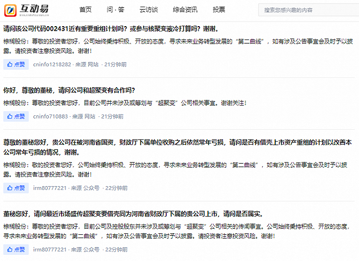 3月8日,就超聚变借壳上市事宜,河南省财政厅旗下城发环境在互动平台回应投资者称,所述事宜与公司无关。3月11日,中原高速、荣科科技等多家河南省财政厅旗下的上市公司继续被投资者在互动平台追问“是否参与超聚变借壳上市”。