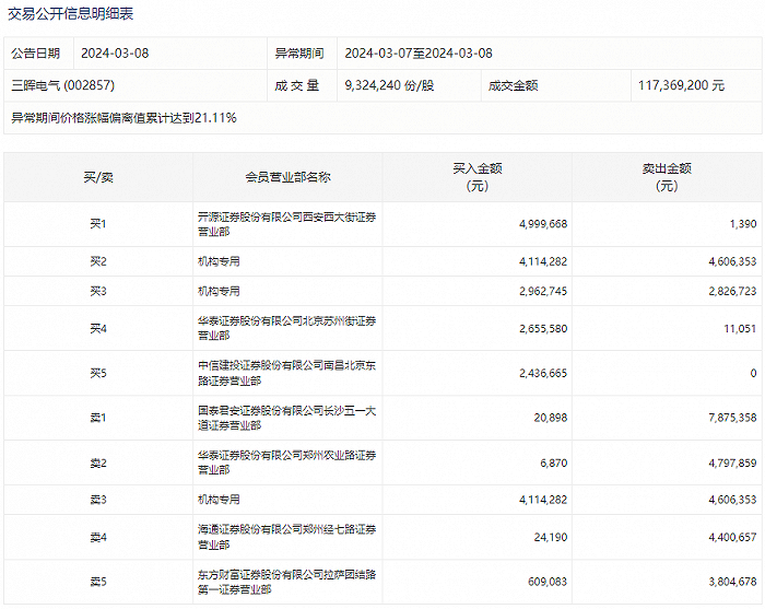 三晖电气于3月8日登上龙虎榜,本轮其机构股东交易活跃。龙虎榜显示,3月7日、8日,营业部账户合计净额卖出1049.41万元,其中两个机构专用账户合计净卖出35.61万元。